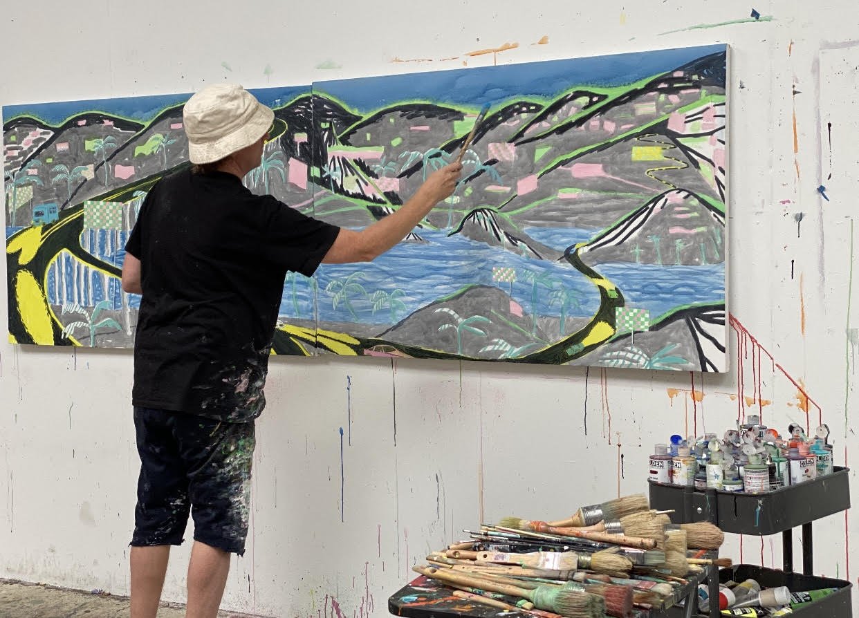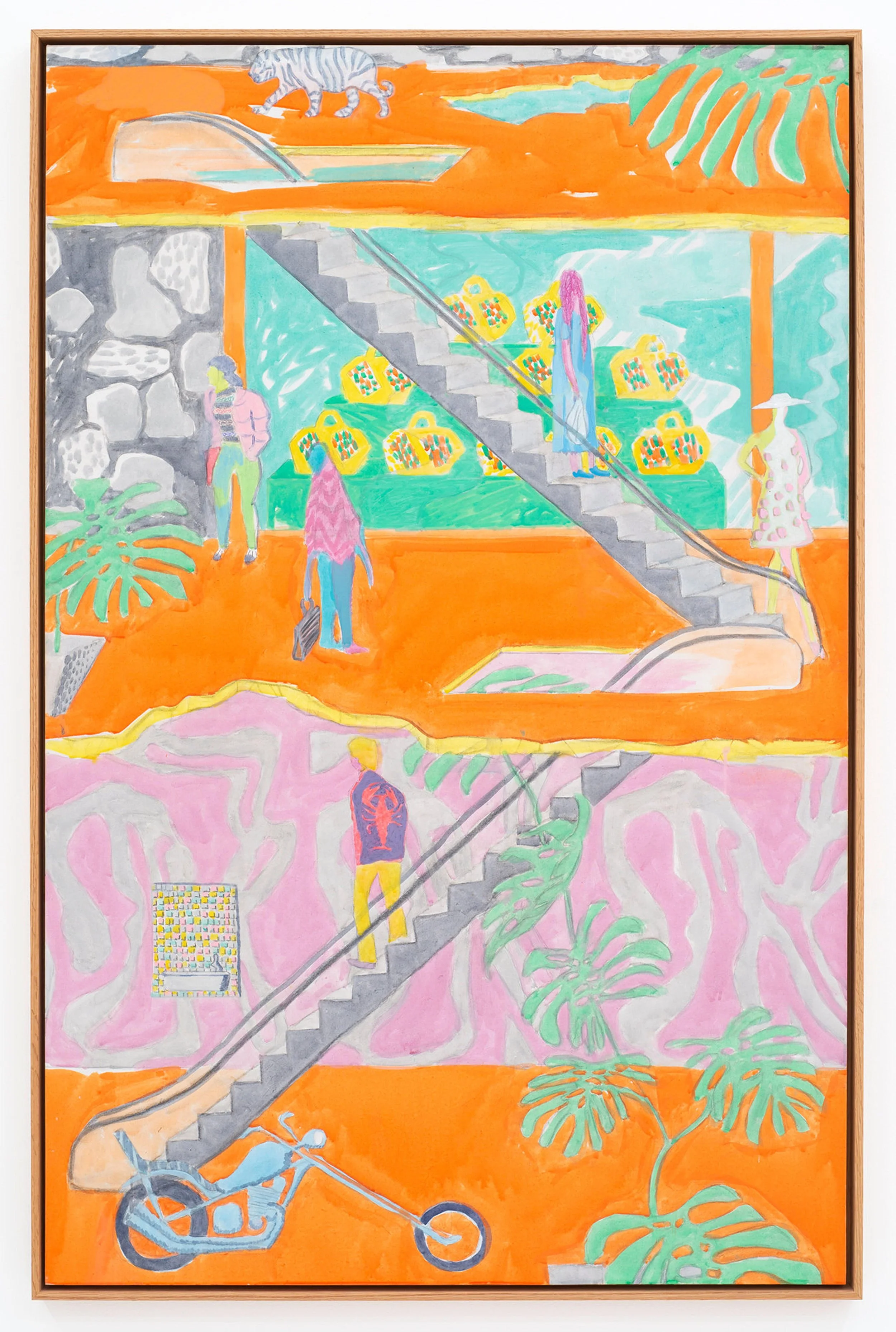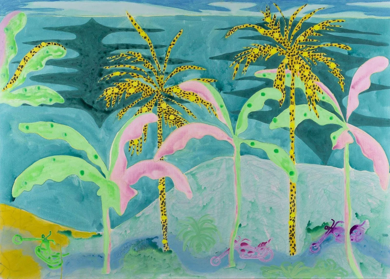 These early aesthetic run-ins are imprinted on my DNA. I’m still chasing a kind of lightness, in subject and form, when addressing a canvas or panel. If some painting is engaged with filling up a work with the weight of history or the complexity of lived human experience, I’m always trying to drain it out to get to something more like a poster or a sticker. Hence the dumb subject matter – motorcycles, palm trees, fashion, malls – and the thin synthetic acrylic color, which I’m told looks like a highlighter marker or slurpee.