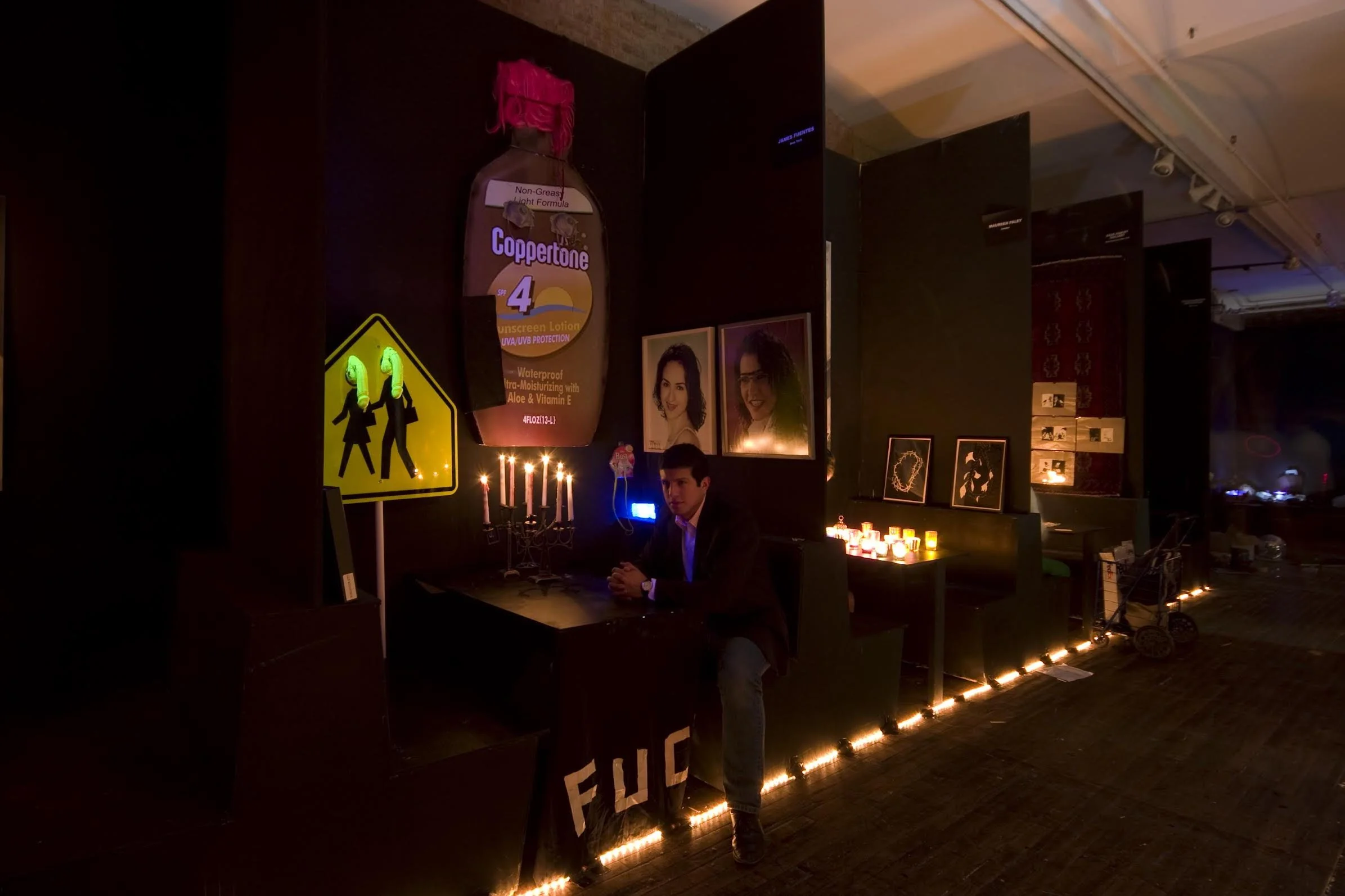 I might describe our curating style as “ What if….?” curating. Rather than a last word on a given group of artists, it’s maybe a first word, a proposition. In the dark? Underwater? On ice? The same art, but with the context flipped. There’s a long history of artists giving curating an inspired go. For the Dark Fair, we took inspiration from Duchamp’s 1942 exhibition “First Papers of Surrealism”, in which he exhibited a greatest hits of European surrealist painting in the dark, candlelit, and covered with a mile of string.